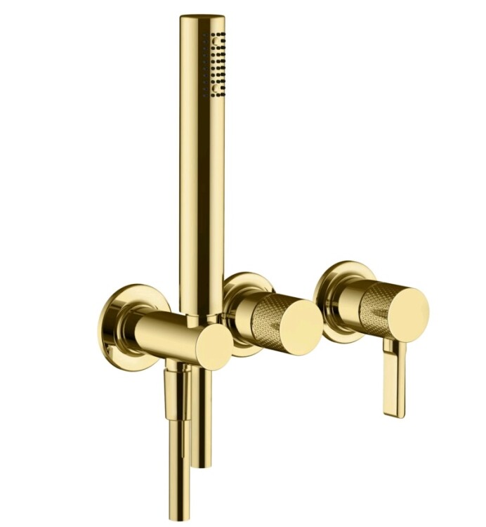 Смеситель для душа, Gessi, Inciso Bath&Shower, на 2 потребителя, тип открывания воды-однорычажный, тип регулирования воды-керамический картридж, монтаж-настенный встраиваемый, отверстия для монтажа-3, в комплекте-переключатель, ручной душ, держатель ручного душа с подводом воды, шланг, мм-1500, внутренняя часть-необходимо заказать, цвет-Brushed Gold PVD Смеситель для душа, Gessi, Inciso Bath&Shower, на 2 потребителя, цвет-Brushed Gold PVD