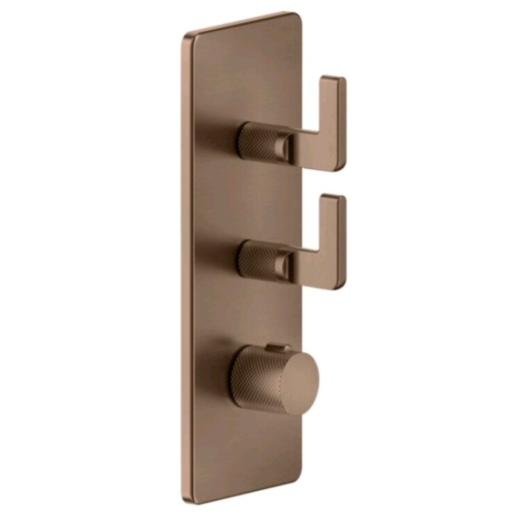 Смеситель для душа, Gessi, Inciso Bath&Shower, на 2 потребителя, тип открывания воды-вентильный, тип регулирования воды-термостатический картридж, монтаж-настенный встраиваемый, отверстия для монтажа-3, установка-вертикальная/горизонтальная, внутренняя часть-необходимо заказать, цвет-Copper Brushed PVD Смеситель для душа, Gessi, Inciso Bath&Shower, на 2 потребителя, цвет-Copper Brushed PVD