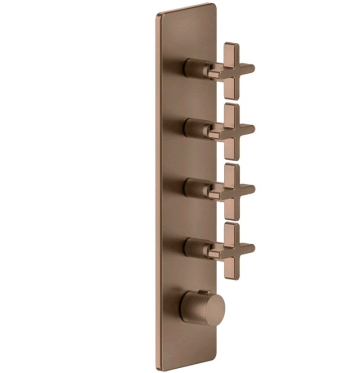 Смеситель для душа, Gessi, Inciso Bath&Shower, на 4 потребителя, тип открывания воды-вентильный, тип регулирования воды-термостатический картридж, монтаж-настенный встраиваемый, отверстия для монтажа-5, установка-вертикальная/горизонтальная, внутренняя часть-необходимо заказать, цвет-Copper Brushed PVD Смеситель для душа, Gessi, Inciso Bath&Shower, на 4 потребителя, цвет-Copper Brushed PVD