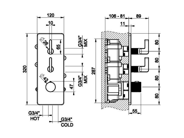 Смеситель для душа, Gessi, Inciso, тип открывания воды-вентильный, тип регулирования воды-термостатический картридж, монтаж-настенный встраиваемый, отверстия для монтажа-3, внутренняя часть-необходимо заказать, цвет-Black XL, подключение 3/4", вертикальная или горизонтальная установка, с 2-мя независимыми выходами Смеситель для душа, Gessi, Inciso, цвет-Black XL