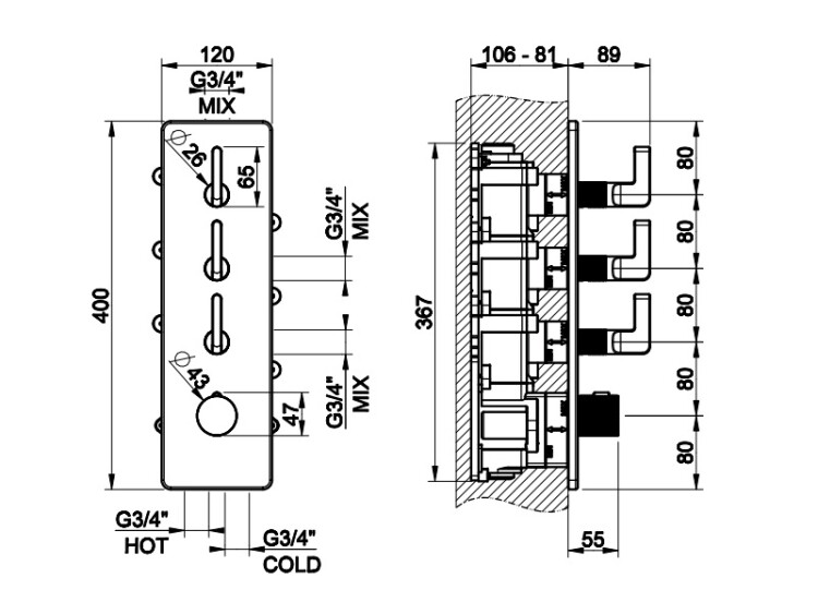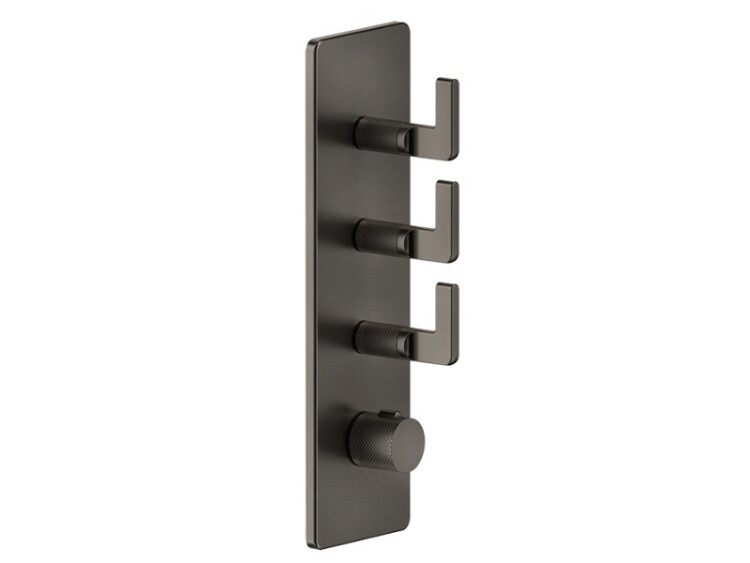 Смеситель для душа, Gessi, Inciso, тип открывания воды-вентильный, тип регулирования воды-термостатический картридж, монтаж-настенный встраиваемый, отверстия для монтажа-4, внутренняя часть-необходимо заказать, цвет-Black XL, подключение 3/4", вертикальная или горизонтальная установка, с 3-мя независимыми выходами Смеситель для душа, Gessi, Inciso, цвет-Black XL
