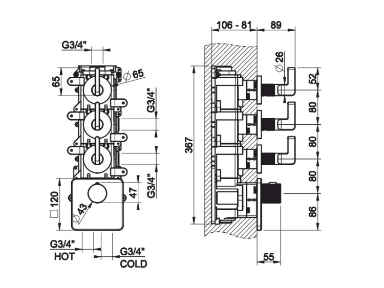 Смеситель для душа, Gessi, Inciso, тип открывания воды-вентильный, тип регулирования воды-термостатический картридж, монтаж-настенный встраиваемый, отверстия для монтажа-4, внутренняя часть-необходимо заказать, цвет-Black XL, подключение 3/4", вертикальная или горизонтальная установка, с 3-мя независимыми выходами Смеситель для душа, Gessi, Inciso, цвет-Black XL