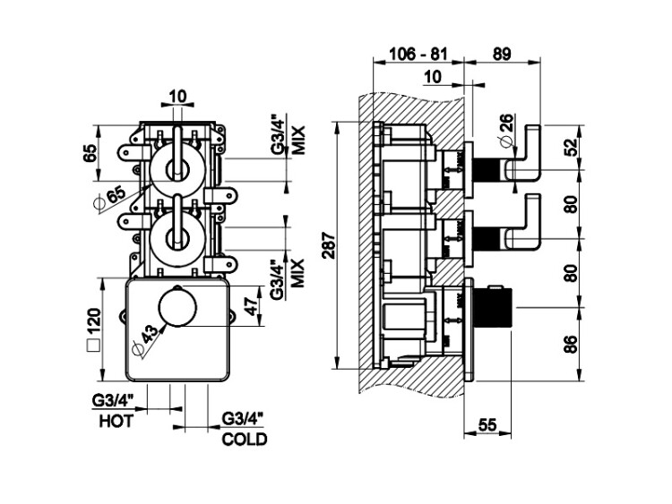 Смеситель для душа, Gessi, Inciso, тип регулирования воды-термостатический картридж, тип установки-встраиваемый, внутренняя часть-необходимо заказать, цвет-хром, резьба 3/4", с двумя независимыми выходами, вертикальная или горизонтальная установка Смеситель для душа, Gessi, Inciso, цвет-хром
