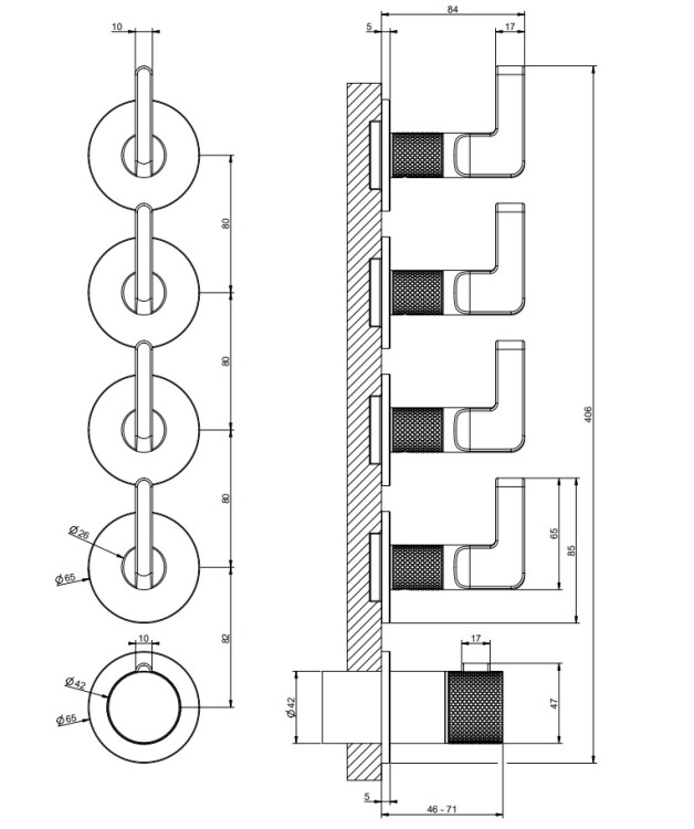 Смеситель для душа, Gessi, Inciso Shower, на 4 потребителей, тип открывания воды-однорычажный, тип регулирования воды-термостатический картридж, монтаж-настенный встраиваемый, установка-вертикальная/горизонтальная, внутренняя часть-необходимо заказать, цвет-Aged Bronze Смеситель для душа, Gessi, Inciso Shower, на 4 потребителя, цвет-Aged Bronze