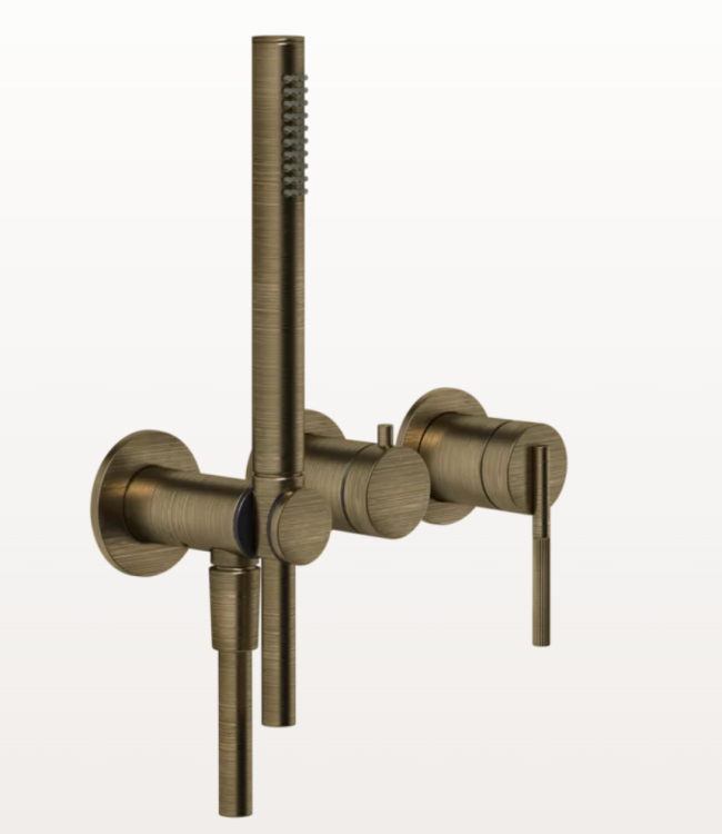 Смеситель для душа, Gessi, Ingranaggio, на 2 потребителя, тип открывания воды-однорычажный, тип регулирования воды-керамический картридж, монтаж-настенный встраиваемый, отверстия для монтажа-3, в комплекте-переключатель, ручной душ, держатель ручного душа с подводом воды, шланг, мм-1500, внутренняя часть-необходимо заказать, цвет-Antique Brass Смеситель для душа, Gessi, Ingranaggio, на 2 потребителя, цвет-Antique Brass