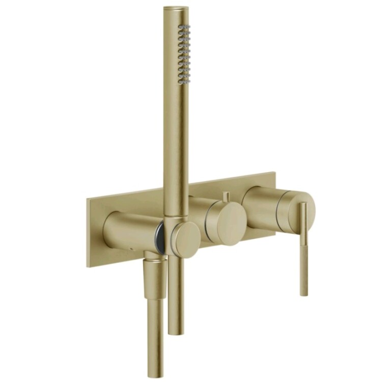 Смеситель для душа, Gessi, Ingranaggio, на 2 потребителя, тип открывания воды-однорычажный, тип регулирования воды-керамический картридж, монтаж-настенный встраиваемый, отверстия для монтажа-3, в комплекте-переключатель, ручной душ, держатель ручного душа с подводом воды. шланг, мм-1500, внутренняя часть-необходимо заказать, цвет-Brushed Brass PVD Смеситель для душа, Gessi, Ingranaggio, на 2 потребителя, цвет-Brushed Brass PVD