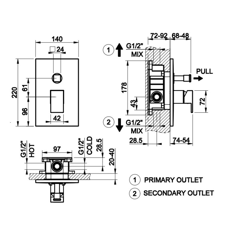 Смеситель для душа, Gessi, Rettangolo, на 2 потребителя, с автоматическим переключателем ванна-душ, тип открывания воды-однорычажный, тип регулирования воды-керамический картридж, монтаж-настенный встраиваемый, отверстия для монтажа-1, внутренняя часть-необходимо заказать, цвет-Brass PVD Смеситель для душа, Gessi, Rettangolo, на 2 потребителя, цвет-Brass PVD