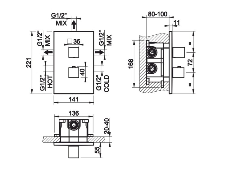 Смеситель для душа, Gessi, Rettangolo shower, тип регулирования воды-термостатический картридж, тип установки-встраиваемый, внутренняя часть-необходимо заказать, цвет-Finox, фильтрами и c переключателем с керамическими дисками, на три позиции на 1/2" Смеситель для душа, Gessi, Rettangolo shower, цвет-Finox