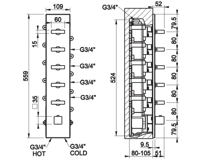Смеситель для душа, Gessi, Rettangolo Wellness, тип регулирования воды-термостатический картридж, тип установки-встраиваемый, внутренняя часть-необходимо заказать, цвет-Copper PVD, подключение на 3/4", с вертикальной/горизонтальной установкой, c пятью независимыми выходами Смеситель для душа, Gessi, Rettangolo Wellness, цвет-Copper PVD