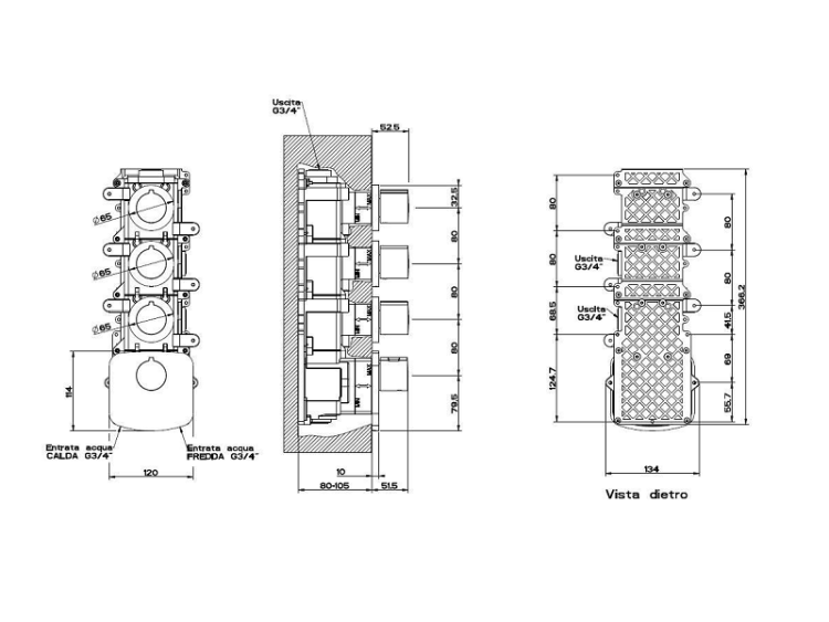 Смеситель для душа, Gessi, Tondo Wellness, тип регулирования воды-термостатический картридж, монтаж-вертикальный встраиваемый (настенный), отверстия для монтажа-4, внутренняя часть-необходимо заказать, цвет-хром, впуски 3/4" Смеситель для душа, Gessi, Tondo Wellness, цвет-хром