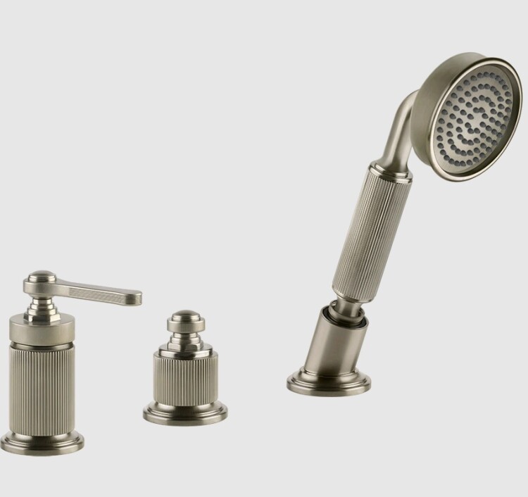 Смеситель для душа, Gessi, VENTI20, на 2 потребителя, тип открывания воды-однорычажный, тип регулирования воды-керамический картридж, монтаж-на борт ванны, отверстия для монтажа-3, в комплекте-переключатель, ручной душ вытяжной, одноструйный, размер ручного душа, мм-78, металлический шланг, мм-1500, гибкие подающие шланги, цвет-Finox Brushed Nickel Смеситель для душа, Gessi, VENTI20, на 2 потребителя, цвет-Finox Brushed Nickel