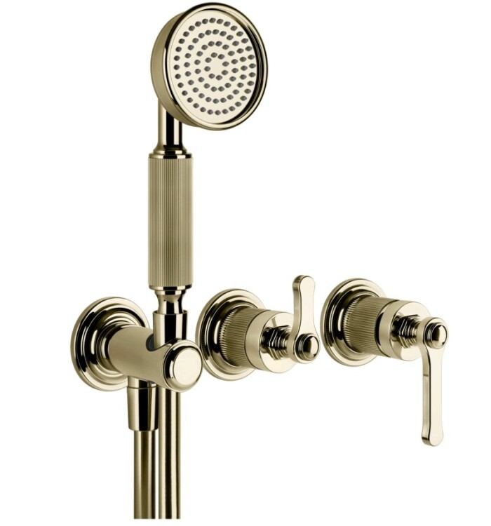 Смеситель для душа, Gessi, VENTI20, на 2 потребителя, тип открывания воды-однорычажный, тип регулирования воды-керамический картридж, монтаж-настенный встраиваемый, отверстия для монтажа-3, в комплекте-переключатель, ручной душ одноструйный, размер ручного душа, мм-78, держатель ручного душа с подводом воды, шланг ПВХ, мм-1500, внутренняя часть-необходимо заказать, цвет-Brass PVD Смеситель для душа, Gessi, VENTI20, на 2 потребителя, цвет-Brass PVD