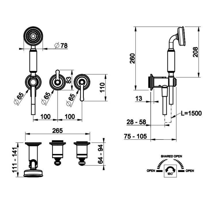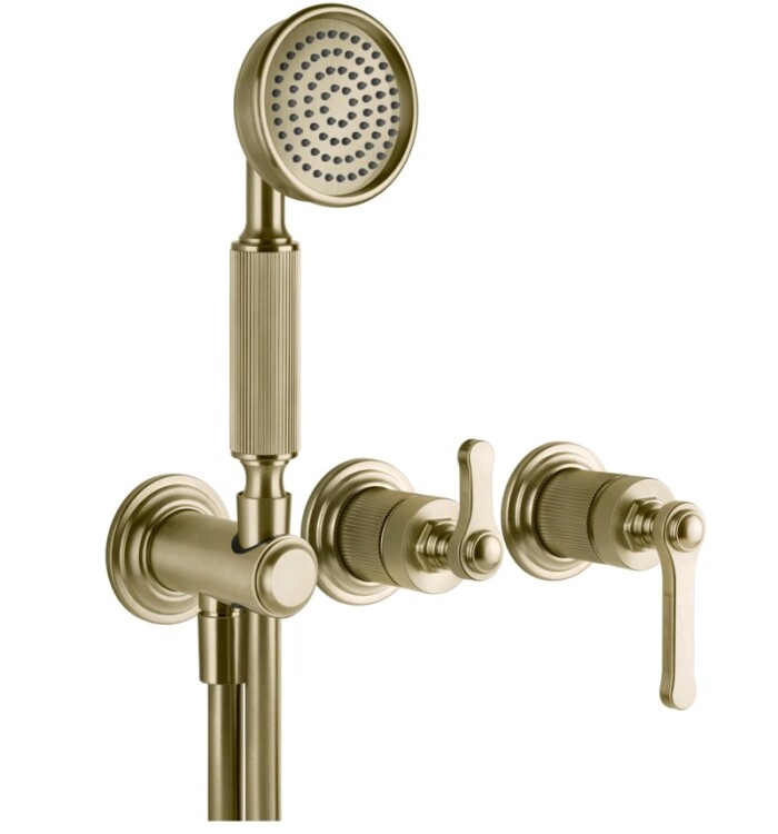 Смеситель для душа, Gessi, VENTI20, на 2 потребителя, тип открывания воды-однорычажный, тип регулирования воды-керамический картридж, монтаж-настенный встраиваемый, отверстия для монтажа-3, в комплекте-переключатель, ручной душ одноструйный, размер ручного душа, мм-78, держатель ручного душа с подводом воды, шланг ПВХ, мм-1500, внутренняя часть-необходимо заказать, цвет-Brushed Brass PVD Смеситель для душа, Gessi, VENTI20, на 2 потребителя, цвет-Brushed Brass PVD