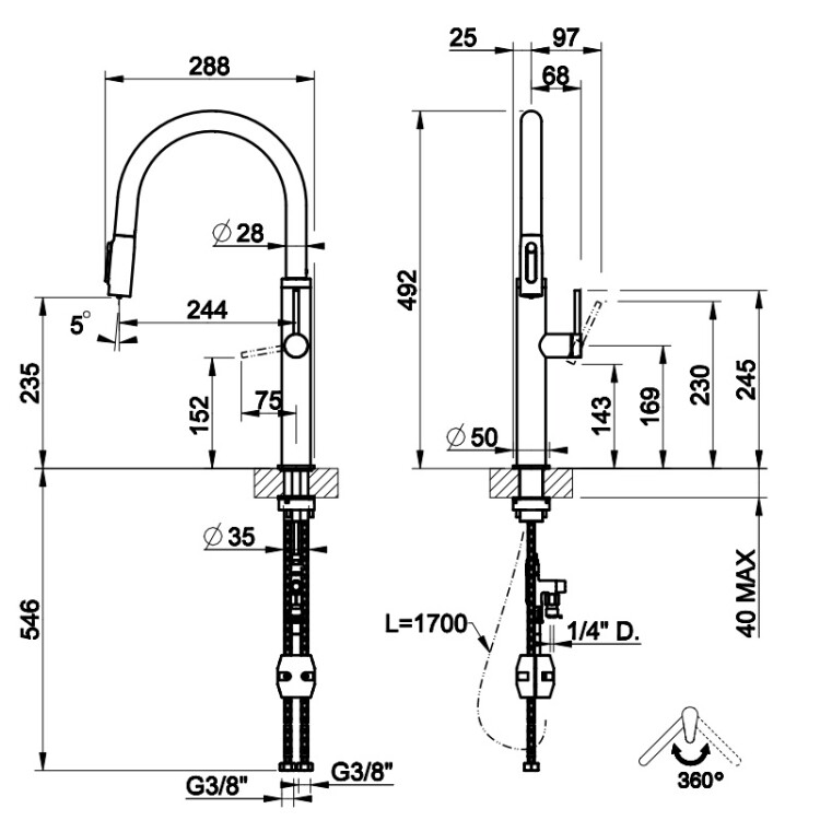 Смеситель для кухни, Gessi, 316 Cesello, тип открывания воды-однорычажный, тип регулирования воды-керамический картридж, монтаж-на раковину/столешницу, отверстия для монтажа-1, высота, мм-492, вынос излива, мм-244, тип излива-выдвижной, поворотный, тип подводки-гибкая, стандарт подвода воды-3/8", цвет-Steel Brushed Смеситель для кухни, Gessi, 316 Cesello, цвет-Steel Brushed