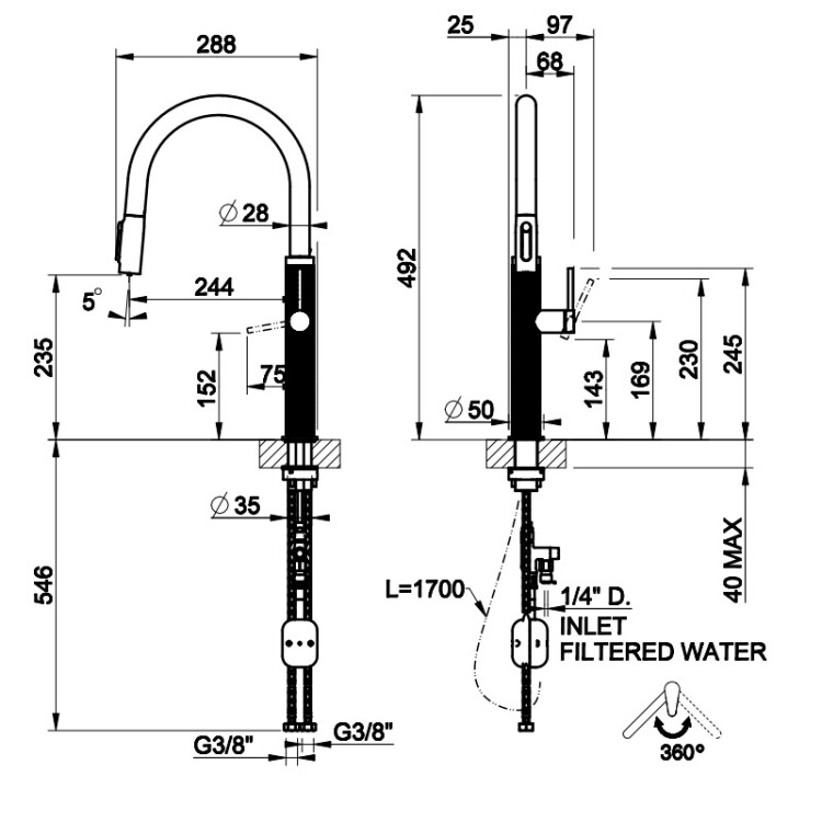 Смеситель для кухни, Gessi, 316 Meccanica, с функцией фильтрации воды, тип открывания воды-однорычажный, тип регулирования воды-керамический картридж, монтаж-на раковину/столешницу, отверстия для монтажа-1, высота, мм-492, вынос излива, мм-244, тип излива-поворотный, тип подводки-гибкая, стандарт подвода воды-3/8", цвет-черный матовый Смеситель для кухни, Gessi, 316 Meccanica, с функцией фильтрации воды, цвет-черный матовый