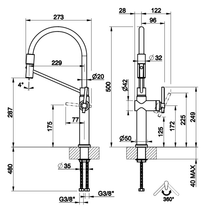 Смеситель для кухни, Gessi, Habito, тип открывания воды-однорычажный, тип регулирования воды-керамический картридж, монтаж-на раковину/столешницу, отверстия для монтажа-1, высота, мм-500, вынос излива, мм-229, тип излива-выдвижной, поворотный, тип подводки-гибкая, стандарт подвода воды-3/8", цвет-хром Смеситель для кухни, Gessi, Habito, цвет-хром