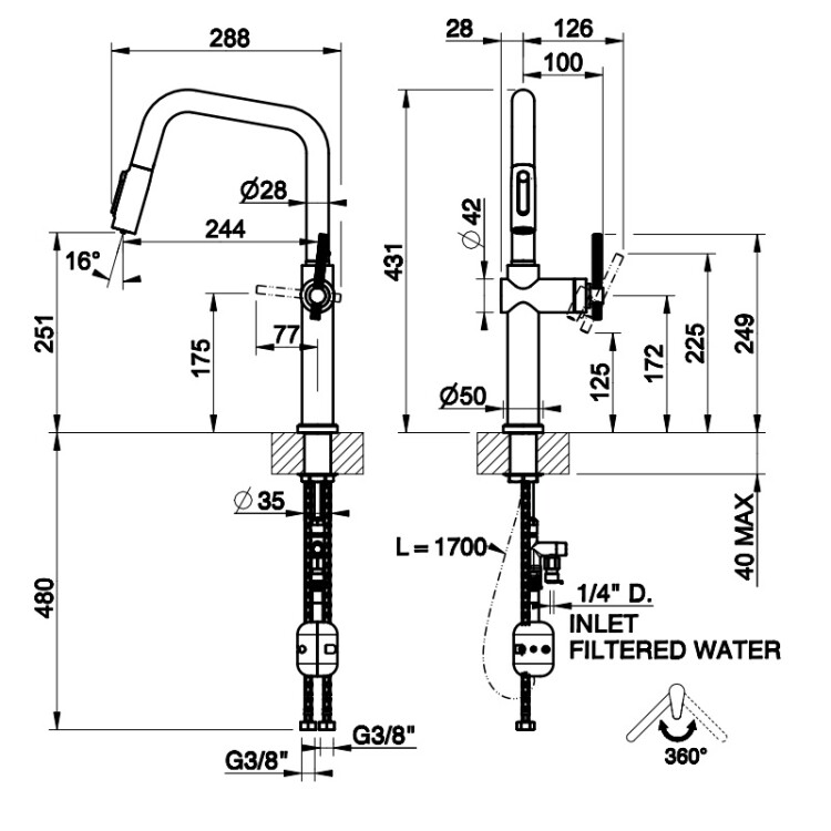 Смеситель для кухни, Gessi, Habito, с функцией фильтрации воды, тип открывания воды-однорычажный, тип регулирования воды-керамический картридж, монтаж-на раковину/столешницу, отверстия для монтажа-1, высота, мм-431, вынос излива, мм-244, тип излива-поворотный, тип подводки-гибкая, стандарт подвода воды-3/8", цвет-Finox Brushed Nickel Смеситель для кухни, Gessi, Habito, с функцией фильтрации воды, цвет-Finox Brushed Nickel