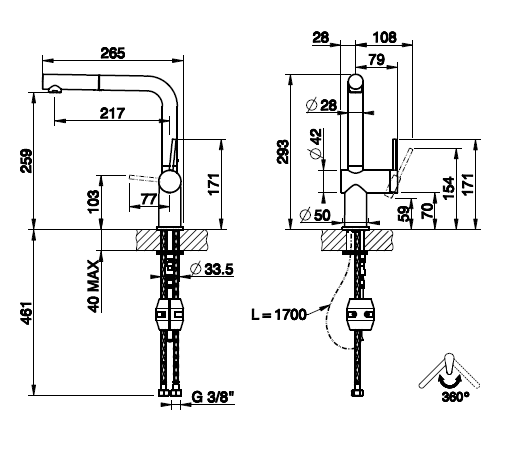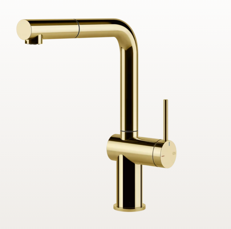 Смеситель для кухни, Gessi, INEDITO, тип открывания воды-однорычажный, тип регулирования воды-керамический картридж, монтаж-на раковину/столешницу, отверстия для монтажа-1, высота, мм-293, вынос излива, мм-217, тип излива-поворотный, тип подводки-гибкая, стандарт подвода воды-3/8", цвет-золото PVD Смеситель для кухни, Gessi, INEDITO, цвет-золото PVD