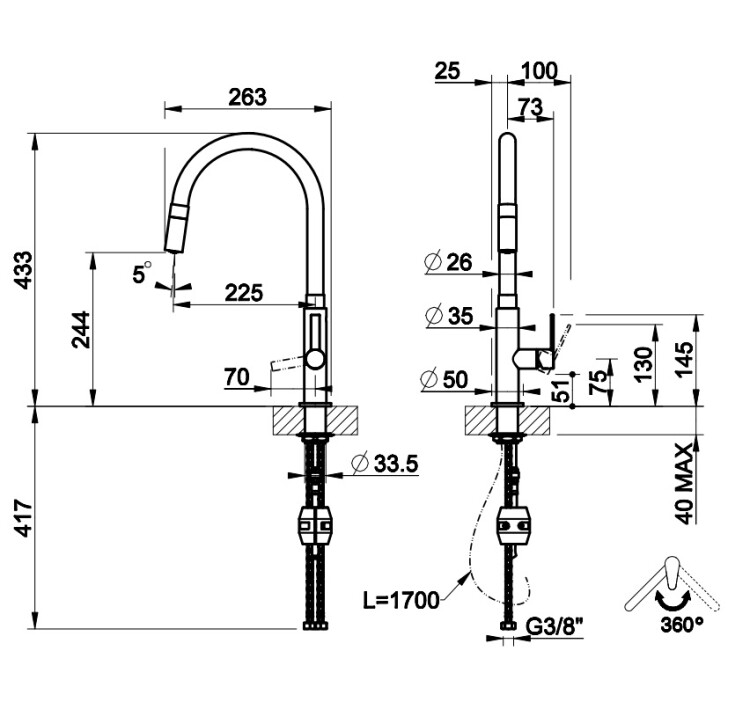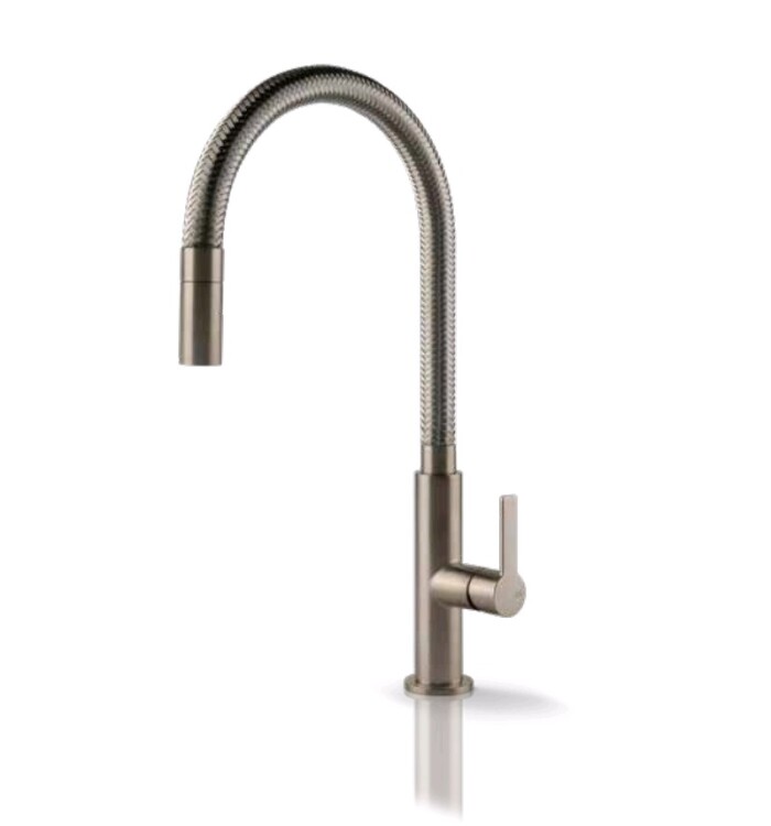 Смеситель для кухни, Gessi, Mesh, тип открывания воды-однорычажный, тип регулирования воды-керамический картридж, монтаж-на раковину/столешницу, отверстия для монтажа-1, высота, мм-433, вынос излива, мм-225, тип излива-поворотный, тип подводки-гибкая, стандарт подвода воды-3/8", цвет-Finox Brushed Nickel Смеситель для кухни, Gessi, Mesh, цвет-Finox Brushed Nickel