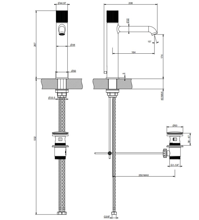 Смеситель для раковины, Gessi, Habito Rigato, тип открывания воды-однорычажный, тип регулирования воды-керамический картридж, монтаж-на раковину/столешницу, отверстия для монтажа-1, высота, мм-267, вынос излива, мм-164, тип излива-неподвижный, донный клапан-есть, тип подводки-гибкая, стандарт подвода воды-3/8", цвет-Finox Brushed Nickel Смеситель для раковины, Gessi, Habito Rigato, цвет-Finox Brushed Nickel
