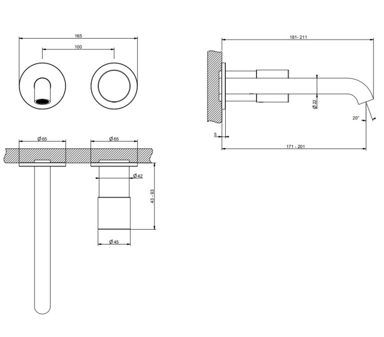 Смеситель для раковины, Gessi, Habito Unito, тип открывания воды-однорычажный, тип регулирования воды-керамический картридж, монтаж-настенный встраиваемый, отверстия для монтажа-2, высота, мм-65, вынос излива, мм-171-201, тип излива-неподвижный, донный клапан-отсутствует, тип подводки-жесткая, стандарт подвода воды-1/2", внутренняя часть-необходимо заказать, цвет-Black Metal Brushed PVD Смеситель для раковины, Gessi, Habito Unito, цвет-Black Metal Brushed PVD
