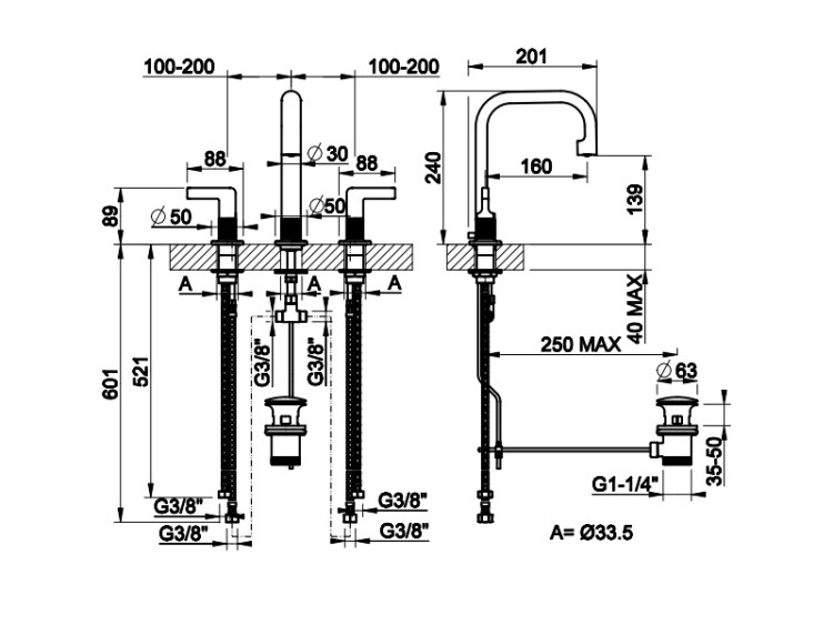 Смеситель для раковины, Gessi, Inciso, тип открывания воды-двухрычажный, отверстия для монтажа-3, высота, мм-240, вынос излива, мм-160, донный клапан-есть, тип подводки-гибкая, стандарт подвода воды-3/8", цвет-Black Metal Brushed PVD Смеситель для раковины, Gessi, Inciso, цвет-Black Metal Brushed PVD