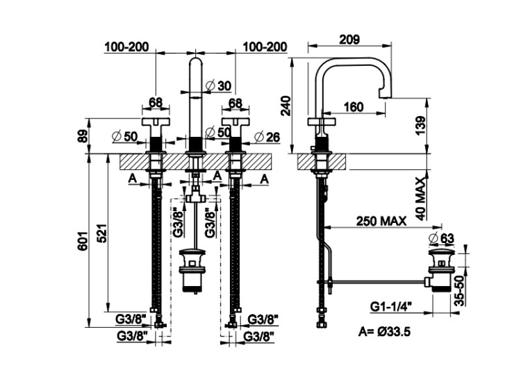 Смеситель для раковины, Gessi, Inciso, тип открывания воды-двухвентильный, отверстия для монтажа-3, высота, мм-240, вынос излива, мм-160, донный клапан-есть, тип подводки-гибкая, стандарт подвода воды-3/8", цвет-Copper PVD Смеситель для раковины, Gessi, Inciso, цвет-Copper PVD