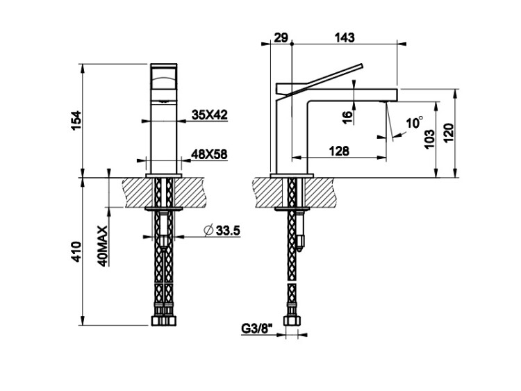Смеситель для раковины, Gessi, Rettangolo K, тип открывания воды-однорычажный, отверстия для монтажа-1, высота, мм-154, вынос излива, мм-128, тип подводки-гибкая, стандарт подвода воды-3/8", цвет-хром Смеситель для раковины, Gessi, Rettangolo K, цвет-хром