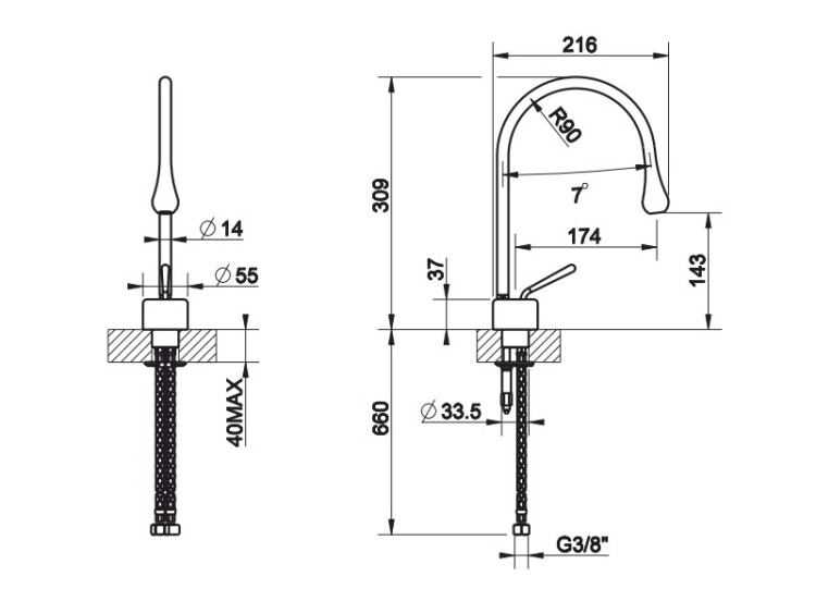Смеситель для раковины, Gessi, Goссia, тип открывания воды-однорычажный, отверстия для монтажа-1, высота, мм-309, вынос излива, мм-174, с радиусом излива-90, тип подводки-гибкая, стандарт подвода воды-3/8", цвет-черный Смеситель для раковины, Gessi, Goссia, цвет-черный