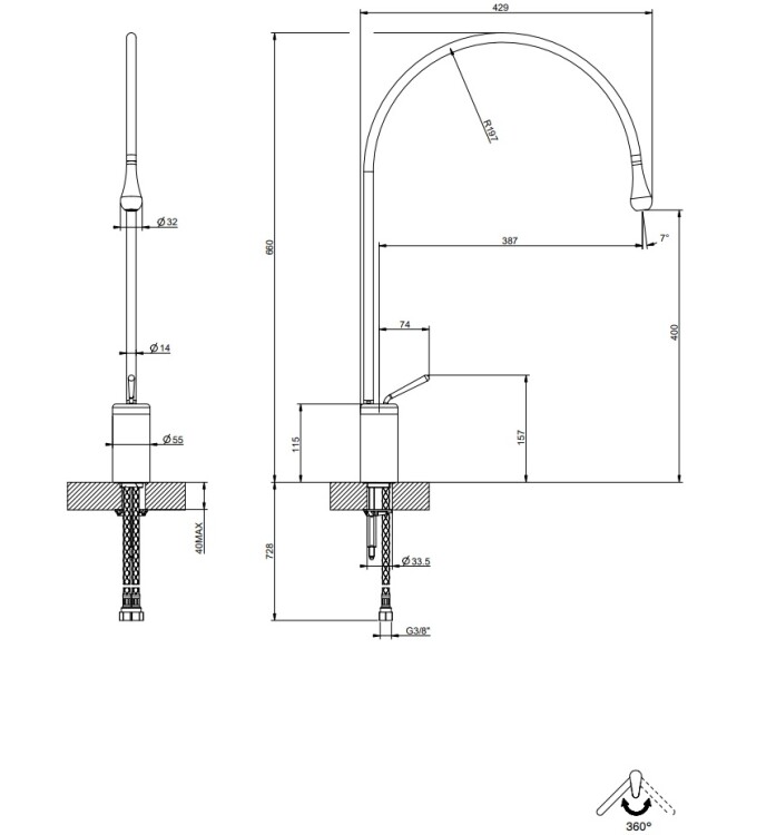 Смеситель для раковины, Gessi, Goссia, тип открывания воды-однорычажный джойстик, тип регулирования воды-керамический картридж, монтаж-на раковину/столешницу, отверстия для монтажа-1, высота, мм-660, вынос излива, мм-387, радиус излива-197, тип излива-поворотный, донный клапан-отсутствует, тип подводки-гибкая, стандарт подвода воды-3/8", цвет-хром Смеситель для раковины, Gessi, Goссia, цвет-хром