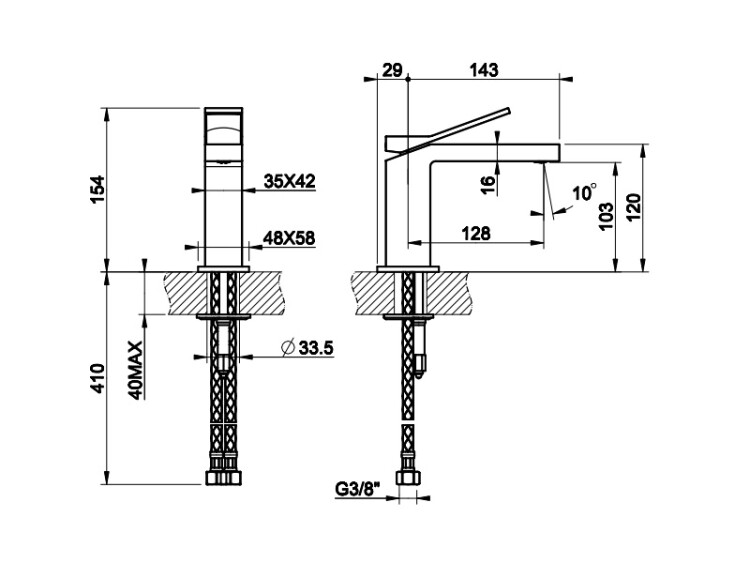 Смеситель для раковины, Gessi, Rettangolo K, тип открывания воды-однорычажный, отверстия для монтажа-1, высота, мм-154, вынос излива, мм-128, тип подводки-гибкая, стандарт подвода воды-3/8", цвет-Finox Смеситель для раковины, Gessi, Rettangolo K, цвет-Finox