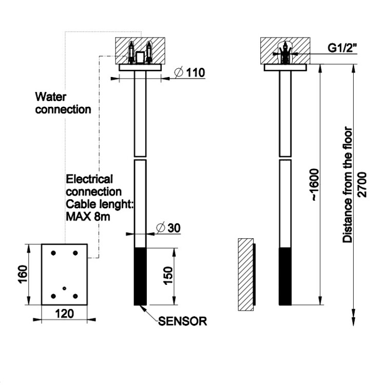 Смеситель для раковины, Gessi, Sensor Taps, тип открывания воды-бесконтактный/электронный, с регулировкой температуры и расхода воды с помощью управления под раковиной (входит в комплект), монтаж-потолочный, отверстия для монтажа-1, высота, мм-2700, вынос излива, мм-1600, тип излива-неподвижный, донный клапан-отсутствует, тип подводки-жесткая, стандарт подвода воды-1/2", внутренняя часть-необходимо заказать, цвет-черный матовый Смеситель для раковины, Gessi, Sensor Taps, цвет-черный матовый