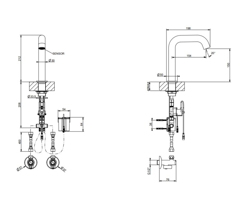 Смеситель для раковины, Gessi, Sensor Taps, тип открывания воды-бесконтактный/электронный, с кран-фильтром для регулировки температуры и напора воды,, монтаж-на раковину/столешницу, отверстия для монтажа-1, высота, мм-212, вынос излива, мм-154, тип излива-неподвижный, донный клапан-отсутствует, тип подводки-гибкая, стандарт подвода воды-3/8", цвет-Warm Bronze Brushed PVD Смеситель для раковины, Gessi, Sensor Taps, цвет-Warm Bronze Brushed PVD