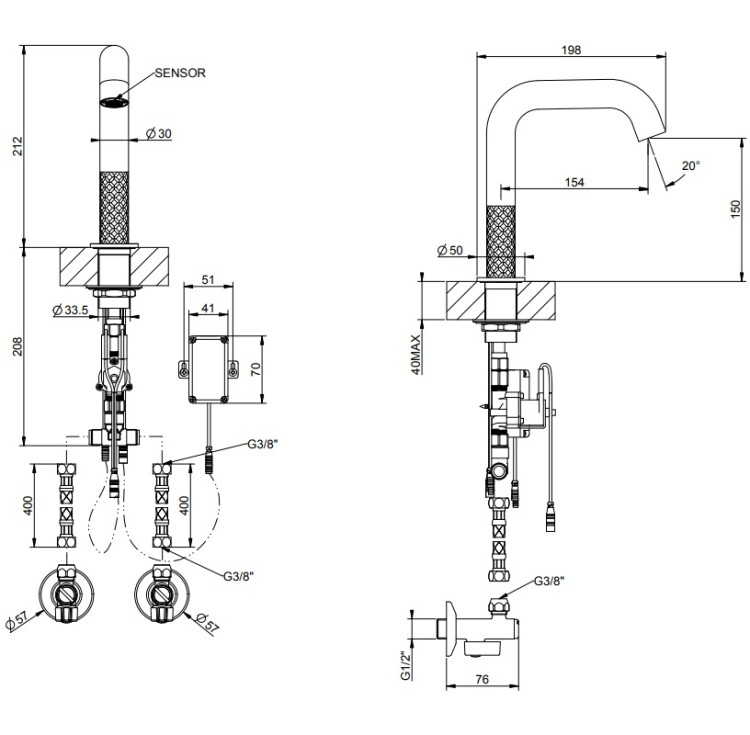 Смеситель для раковины, Gessi, Sensor Taps, тип открывания воды-бесконтактный/электронный, с кран-фильтром для регулировки температуры и напора воды, монтаж-на раковину/столешницу, отверстия для монтажа-1, высота, мм-212, вынос излива, мм-154, тип излива-неподвижный, донный клапан-отсутствует, тип подводки-гибкая, стандарт подвода воды-3/8", цвет-Warm Bronze Brushed PVD Смеситель для раковины, Gessi, Sensor Taps, цвет-Warm Bronze Brushed PVD