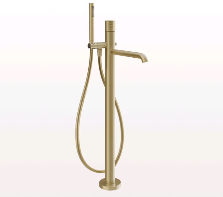 Смеситель для ванны и душа, Gessi, Habito Bath-Shower, тип открывания воды-однорычажный, тип регулирования воды-керамический картридж, монтаж-напольный, отверстия для монтажа-1, вынос излива, мм-260, ручной душ-в комплекте, внутренняя часть-необходимо заказать, цвет-Brushed Brass PVD Смеситель для ванны и душа, Gessi, Habito Bath-Shower, цвет-Brushed Brass PVD