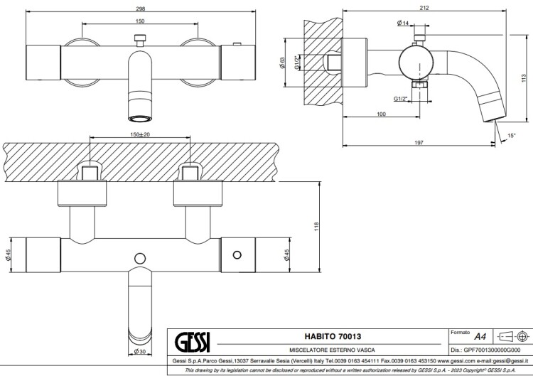 Смеситель для ванны и душа, Gessi, Habito Unito, тип открывания воды-однорычажный, тип регулирования воды-термостатический картридж, монтаж-настенный, отверстия для монтажа-2, вынос излива, мм-197, тип излива-неподвижный, цвет-медь брашированная/шлифованная PVD (Copper Brushed PVD) Смеситель для ванны и душа, Gessi, Habito Unito, цвет-медь брашированная/шлифованная PVD (Copper Brushed PVD)