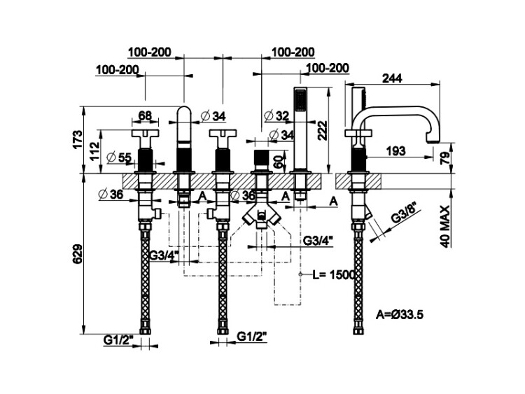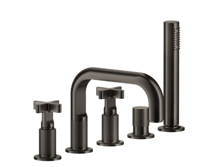 Смеситель для ванны и душа, Gessi, Inciso, тип открывания воды-двухвентильный, тип установки-на борт ванны, отверстия для монтажа-5, вынос излива, мм-193, переключатель, ручной душ, форма лейки-цилиндрическая, диаметр,мм-32, шланг,мм-1500, цвет-Copper Brushed PVD Смеситель для ванны и душа, Gessi, Inciso, цвет-Copper Brushed PVD