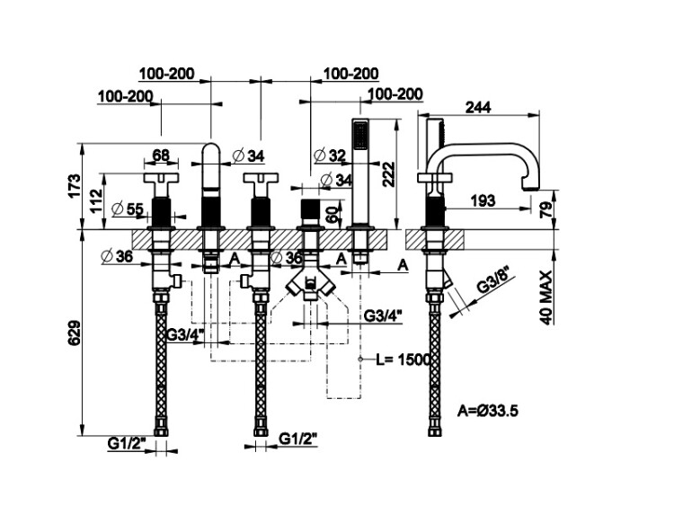 Смеситель для ванны и душа, Gessi, Inciso, тип открывания воды-двухвентильный, тип установки-на борт ванны, отверстия для монтажа-5, вынос излива, мм-193, цвет-Copper PVD, переключатель, ручной душ, форма-цилиндрическая, диаметр,мм-32, шланг,мм-1500 Смеситель для ванны и душа, Gessi, Inciso, цвет-Copper PVD