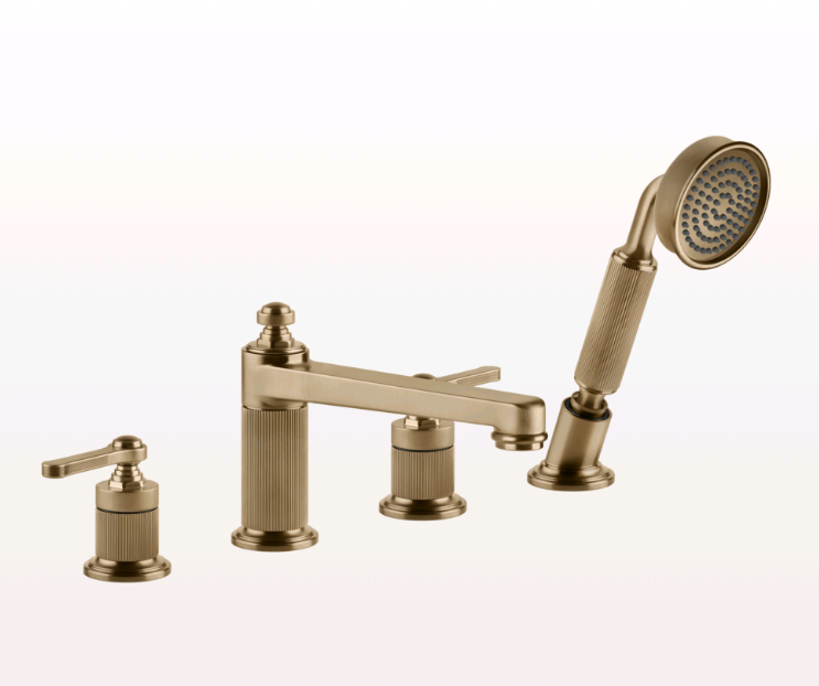 Смеситель для ванны, Gessi, VENTI20, тип открывания воды-двухвентильный, тип регулирования воды-керамическая кран-букса, монтаж-на борт ванны, отверстия для монтажа-4, вынос излива, мм-190, ручной душ-есть (с защитой от известкового налёта), с переключателем, шланг-есть, длина шланга,мм-1500, цвет-Antique Brass Смеситель для ванны и душа, Gessi, VENTI20, цвет-Antique Brass