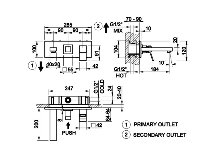 Смеситель для ванны и душа, Gessi, Rettangolo K, тип открывания воды-однорычажный, тип регулирования воды-керамический картридж, монтаж-настенный встраиваемый, отверстия для монтажа-2, вынос излива, мм-184, тип излива-неподвижный, внутренняя часть-необходимо заказать, цвет-хром, на 2 выхода, с переключателем Смеситель для ванны и душа, Gessi, Rettangolo K, цвет-хром