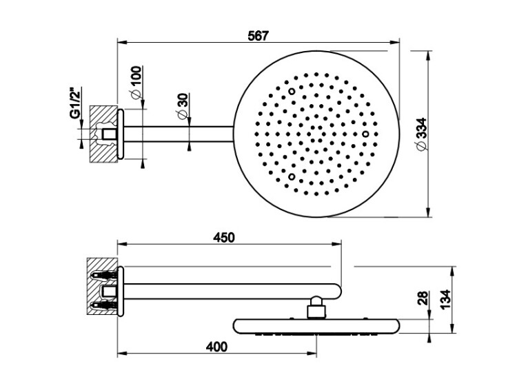 Верхний душ, Gessi, Goссia, тип установки-настенный, ширина, мм-334, глубина, мм-567, высота, мм-134, форма-круглая, держатель-есть, размер держателя-450, душевая головка шарнирная, диаметр,мм-306, на 1/2", цвет-хром Верхний душ, Gessi, Goссia, шгв 334*567*134, цвет -хром