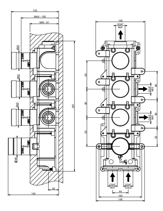 Внутренняя часть, Gessi, назначение-смеситель для душа термостатический на 3 независимых выхода, стандарт подвода воды-3/4", цвет-хром Внутренняя часть, Gessi, назначение-смеситель для душа термостатический на 3 независимых выхода, цвет-хром