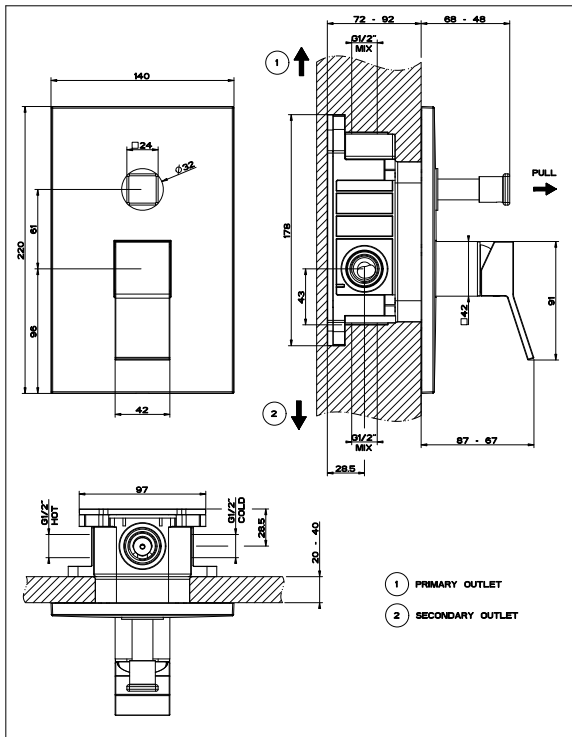 Смеситель для душа, Gessi, Rettangolo K, тип открывания воды-однорычажный, тип регулирования воды-керамический картридж, тип установки-настенный встраиваемый, внутренняя часть-необходимо заказать, цвет-хром, на 2 выхода с переключателем ванна-душ Смеситель для душа, Gessi, Rettangolo K, цвет-хром