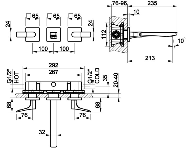Смеситель для раковины, Gessi, Rilievo, тип открывания воды-вентильный, тип регулирования воды-керамическая кран-букса, монтаж-настенный встраиваемый, отверстия для монтажа-3, высота, мм-65, вынос излива, мм-213, тип излива-неподвижный, донный клапан-отсутствует, тип подводки-жесткая, стандарт подвода воды-1/2", внутренняя часть-необходимо заказать, цвет-хром Смеситель для раковины, Gessi, Rilievo, цвет-хром