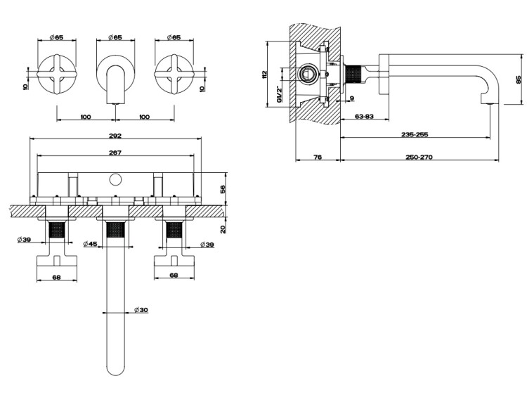 Смеситель для раковины, Gessi, Inciso, тип открывания воды-вентильный, тип регулирования воды-керамическая кран-букса, монтаж-настенный встраиваемый, отверстия для монтажа-3, высота, мм-85, вынос излива, мм-235-255, тип излива-неподвижный, донный клапан-отсутствует, тип подводки-жесткая, стандарт подвода воды-1/2", внутренняя часть-необходимо заказать, цвет-Finox Brushed Nickel Смеситель для раковины, Gessi, Inciso, цвет-Finox Brushed Nickel