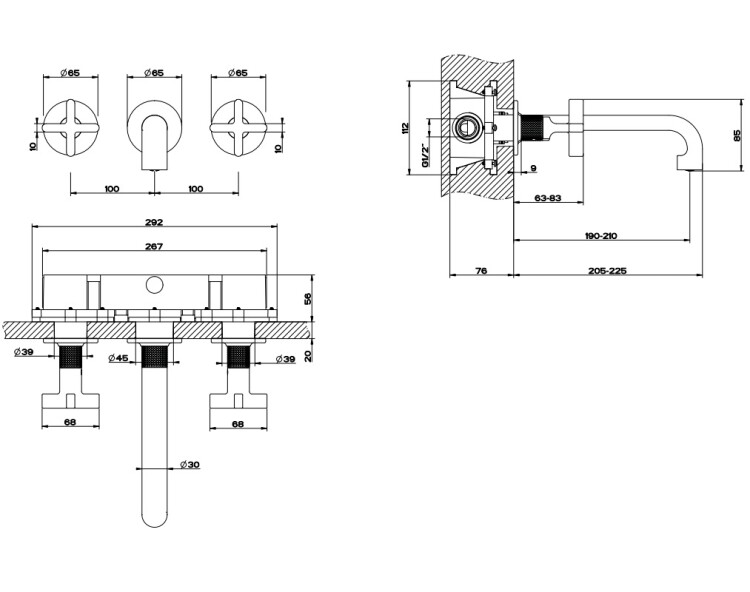Смеситель для раковины, Gessi, Inciso, тип открывания воды-вентильный, тип регулирования воды-керамическая кран-букса, монтаж-настенный встраиваемый, отверстия для монтажа-3, высота, мм-85, вынос излива, мм-190-210, тип излива-неподвижный, донный клапан-отсутствует, тип подводки-жесткая, стандарт подвода воды-1/2", внутренняя часть-необходимо заказать, цвет-черный матовый Смеситель для раковины, Gessi, Inciso, цвет-черный матовый