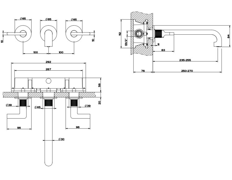 Смеситель для раковины, Gessi, Inciso, тип открывания воды-вентильный, тип регулирования воды-керамическая кран-букса, монтаж-настенный встраиваемый, отверстия для монтажа-3, высота, мм-84, вынос излива, мм-235-255, тип излива-неподвижный, донный клапан-отсутствует, тип подводки-жесткая, стандарт подвода воды-1/2", внутренняя часть-необходимо заказать, цвет-черный матовый Смеситель для раковины, Gessi, Inciso, цвет-черный матовый