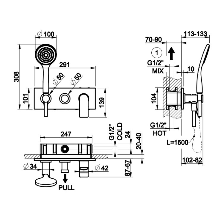 Смеситель для душа, Gessi, Rilievo, на 2 потребителя, тип открывания воды-однорычажный, тип регулирования воды-керамический картридж, монтаж-настенный встраиваемый, отверстия для монтажа-1, в комплекте-переключатель, ручной душ, держатель ручного душа с подводом воды, шланг, мм-1500, внутренняя часть-необходимо заказать, цвет-хром Смеситель для душа, Gessi, Rilievo, на 2 потребителя, цвет-хром