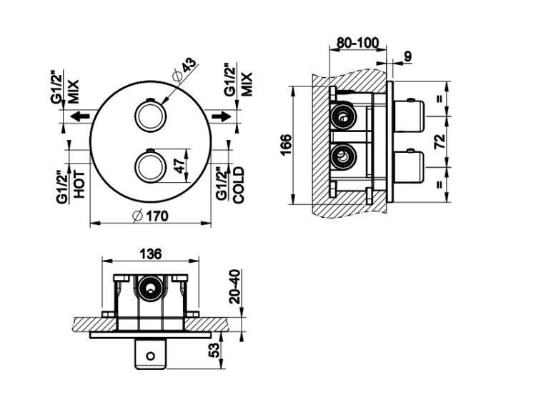 Смеситель для душа, Gessi, Goссia, тип регулирования воды-термостатический картридж, тип установки-встраиваемый, внутренняя часть-необходимо заказать, цвет-черный XL, с подключением на 3/4”, фильтрами и переключателем с керамическими дисками, на две позиции на 1/2” Смеситель для душа, Gessi, Goссia, цвет-черный XL