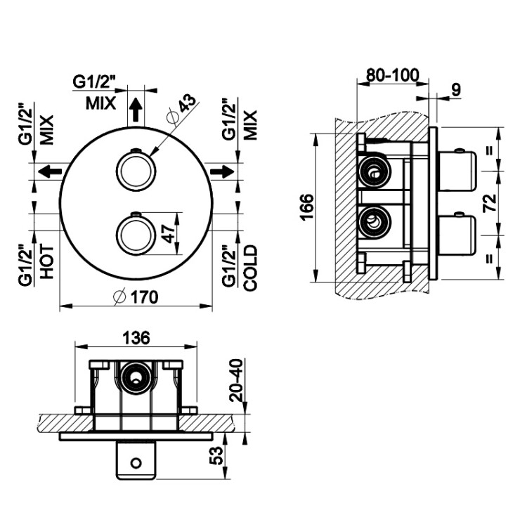 Смеситель для душа, Gessi, Goссia, на 3 потребителя, тип открывания воды-вентильный, тип регулирования воды-термостатический картридж, монтаж-настенный встраиваемый, отверстия для монтажа-2, внутренняя часть-необходимо заказать, цвет-черный матовый Смеситель для душа, Gessi, Goссia, на 3 потребителя, цвет-черный матовый